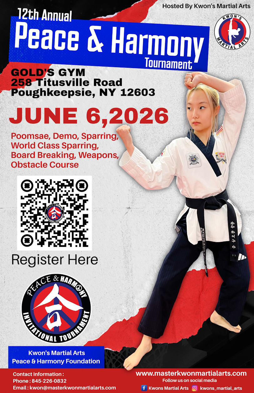 We are excited to announce our 12th Annual Peace & Harmony Tournament, hosted by Kwon's Martial Arts on June 6, 2026.